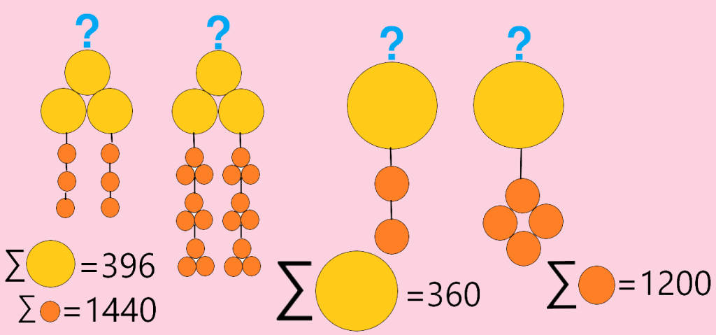 題目: 有四種花燈,樓上第一種上面綁3個大燈球,下面綁6個小燈球,總計9個大小燈球綁成一個花燈;第二種是上面綁3個大燈球,下面綁18個小燈球,總計要21個大小燈球綁成一個花燈。樓上第一種和第二種花燈的大燈球總計396個,小燈球有1440個。樓下第三種是1個大燈球,下面綁2個小燈球;第四種是1個大燈球,下面綁著4個小燈球。樓下第三種和第四種花燈的大燈球總計是360個,小燈球有1200個。請問這四種花燈各有多少個?